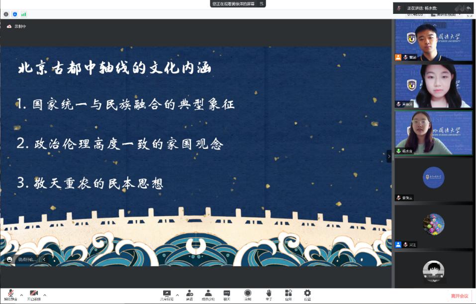 19级本科生曹涵首先发言。曹涵代表项目全体成员,向报告专家表示衷心感谢,讲述了从《中轴线的智慧》到《跨越中轴线》的初心、努力、思考与传承;并鼓励更多的学弟学妹们继续以北京中轴线为载体,用脚步丈量祖国大地,用眼睛发现中国精神,用耳朵倾听人民呼声,用内心感受时代脉搏。接下来,《跨越中轴线》大创项目负责人,红桃视频