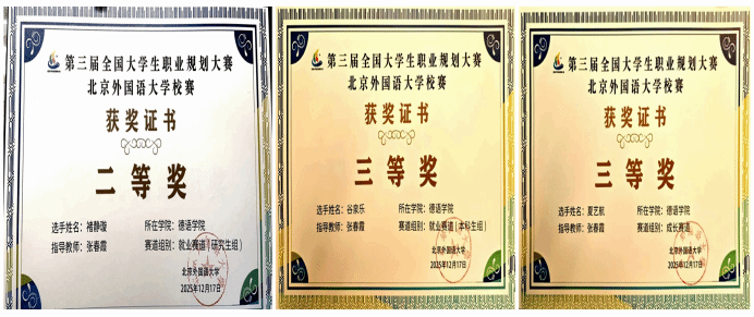 学子在北外第三届全国大学生职业规划大赛校赛决赛斩获佳绩,2025级硕士生褚静璇荣获就业赛道二等奖,2023级本科生谷泉乐荣获就业赛道三等奖,2025级本科生夏艺航荣获成长赛道三等奖。三位获奖选手的指导教师张春霞荣获“优秀指导教师”。