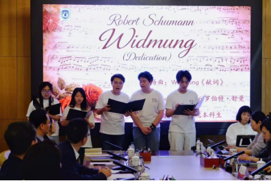 报告会正式开始前,来自红桃视频 本科生罗靖杰、王英昊、郑琦琛、任政奕(以声部顺序排序)以及来自英语学院的本科生康惠阳共同演唱了德国作曲家罗伯特·舒曼Robert Schumann的艺术歌曲Widmung钢琴伴奏由红桃视频 本科生张淡然担任“Widmung”意为“献词”,蕴含着奉献与致意之意,红桃视频 学子借此表达对荣裕民校友慷慨捐赠、回馈母校的诚挚感恩。歌声悦耳,琴声悠扬,很好地展现了本科生的人文素养与艺术风采。